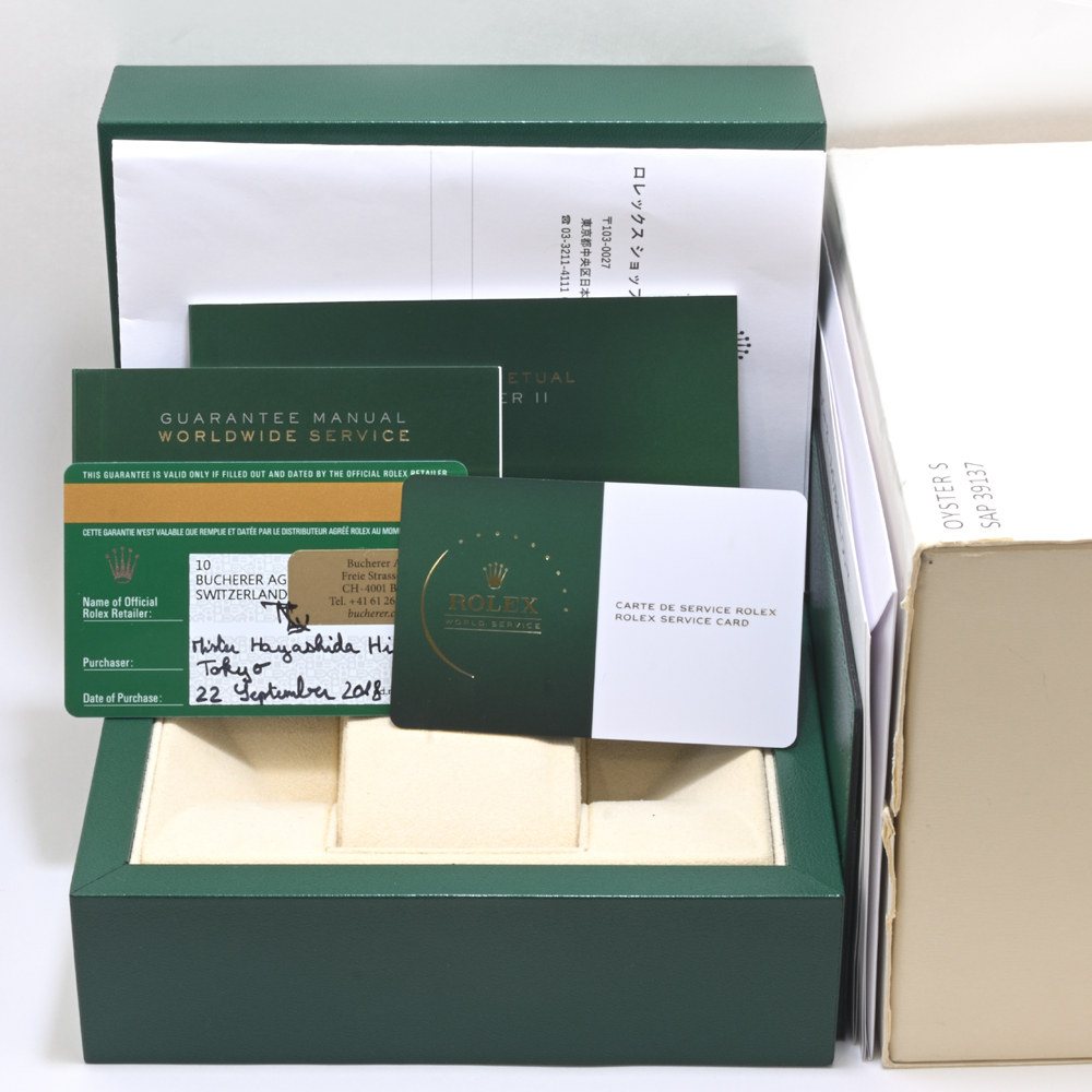 - 外箱 内箱 ドイツ語取説 保証書カード(2018年 9月 スイス ブヘラ) 緑の丸いタグ ベゼル保護キャップ 日本ロレックスオーバーホール明細とサービスカード(2024年4月) *サービスカードの内容確認には、NFC機能が搭載されたスマートフォンが必要です。*箱は小さめなので他のモデルの箱かもしれません。幅約15cmで箱の型番は39139.04です。GMTマスターの場合、約18cm幅の型番39139が多いように思われます。*スイスの都市バーゼルはドイツ語圏なのでドイツ語の取説が付属しています。