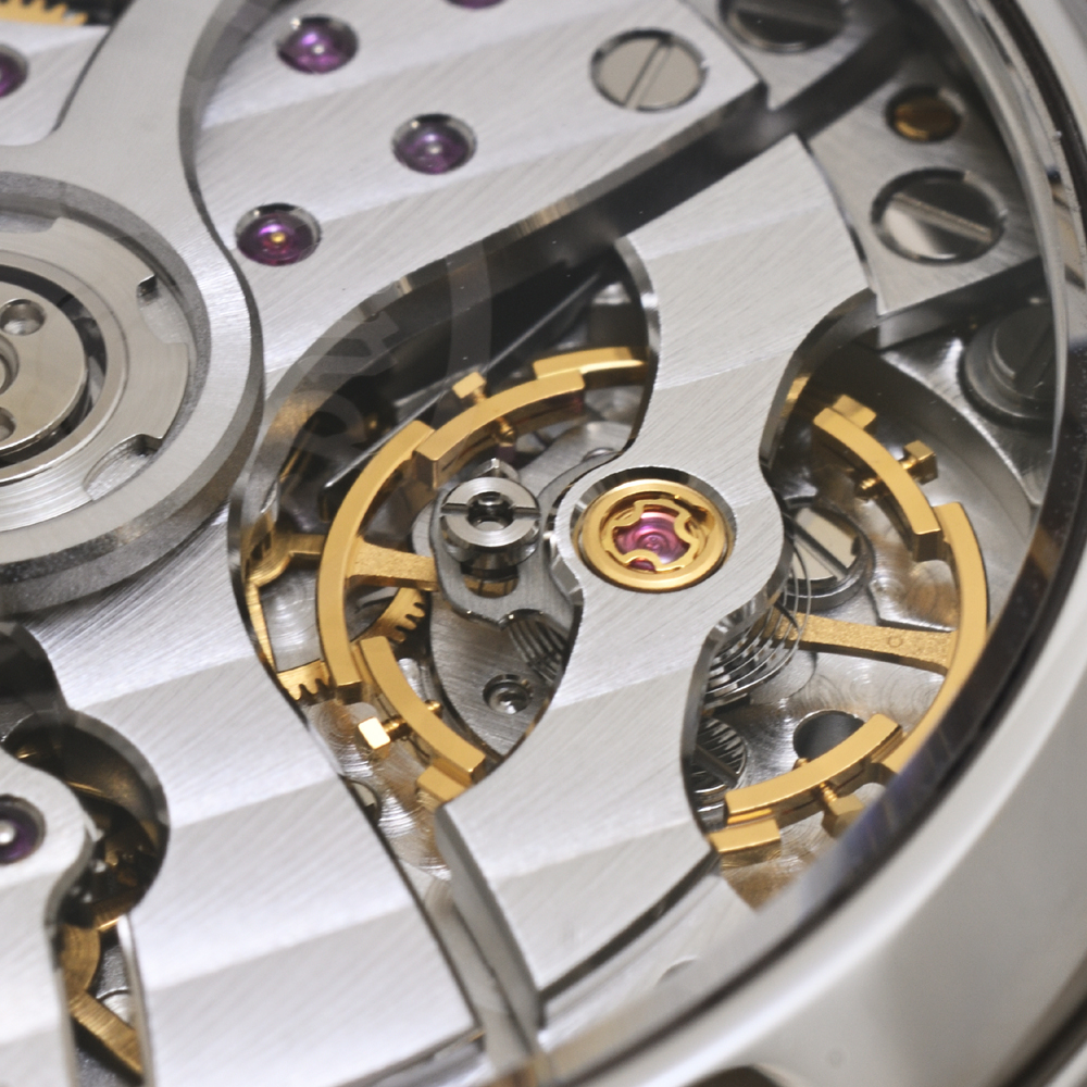 *47石 ダイヤショック耐震装置 ブレゲひげぜんまい ミーンタイムスクリュー付てんぷ フリースプラング緩急調整方式 36,000振動 ツインバレルによる最大約80時間(3日間以上)のぜんまい持続時間 秒針停止機能
