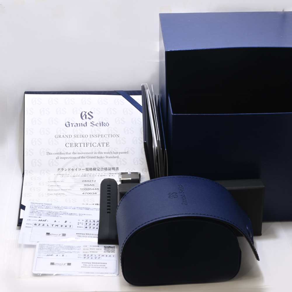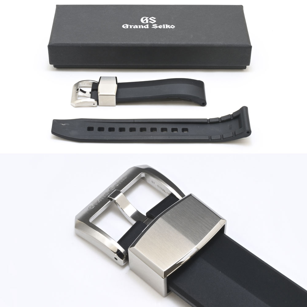 - 外箱 内箱 保証書カード(2025年2月 国内正規) メンテナンスサポートカード GS検定合格証明書 *取説は元々なく、公式ウェブサイトで閲覧するようになっています。*純正ラバーベルトと純正SS尾錠も付いています。ラバーベルトの金属製の遊革を眺めていると、往年の名作グランドセイコーVFA 6186-8000の面影が感じられるような気がします。