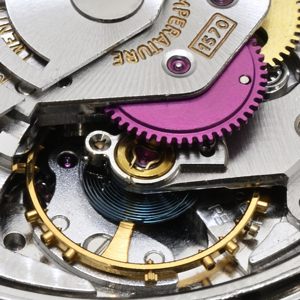 *サイクロップレンズについてですが、プラ風防のサイクロップレンズは意外と見やすいと思います。サファイアガラスのサイクロップレンズのほうが圧倒的に有利な気がするのですが、実際はプラ風防のほうが見やすいと思います。プラ風防のほうがサファイアガラスに比べて若干倍率が低いので見やすいのでしょうか。実使用時は正面からだけではなく、いろいろな方向からカレンダーを見ますが、プラ風防のほうが文字の歪みが少ないと思います。また乱反射もプラ風防のほうが少なくスッキリと見えます。この差については、倍率だけではなく製造方法の違いもあるのかもしれません。プラ風防はレンズと風防が一体成型と思われますので、レンズが理想的に機能しているのかもしれません。サファイアガラス風防の場合はレンズを貼り合わせていると思われますので、どうしても好ましくない屈折率の変化が生じてしまうのでしょうか。
