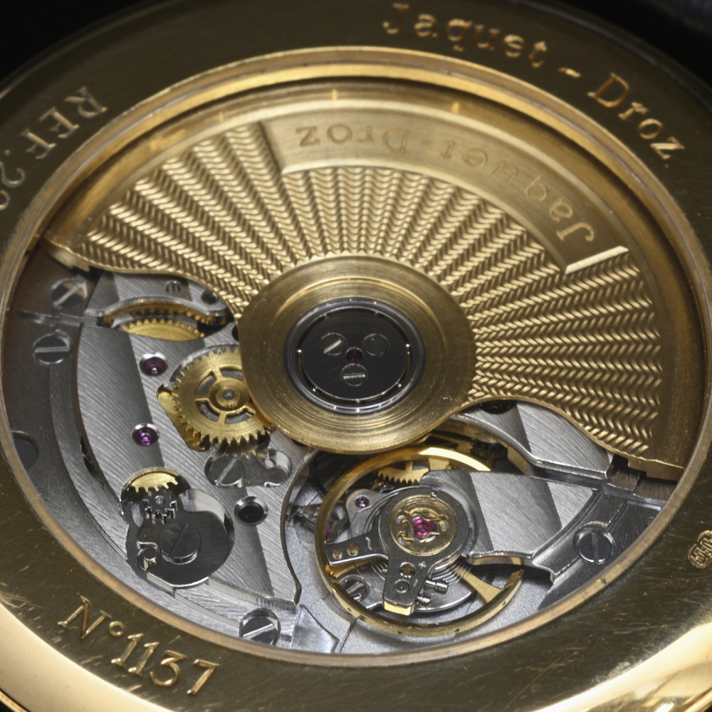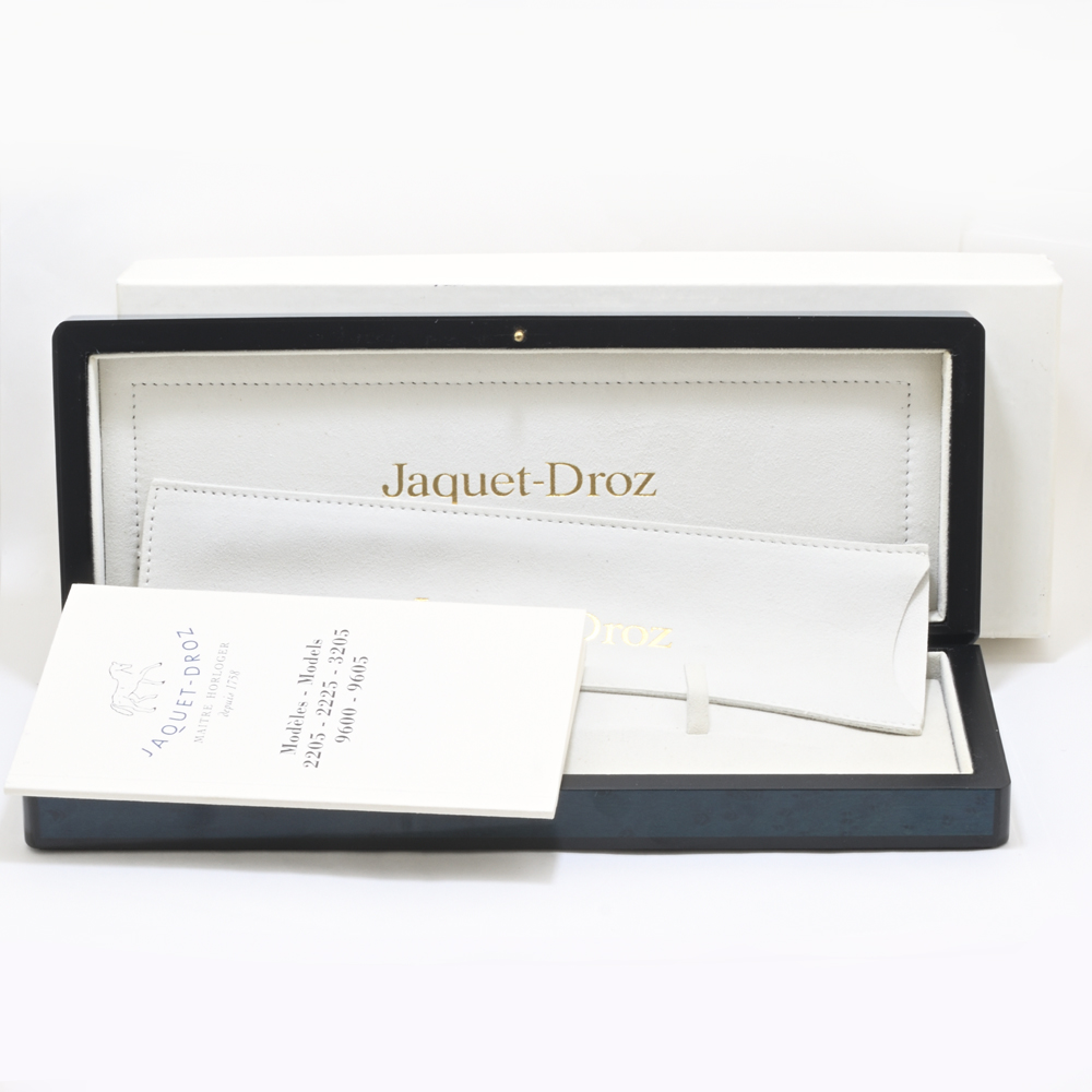 - *ケースやリューズに施されたなめらかな曲線の彫りや、美しいタペストリー文字盤がとても魅力的です。内箱のなんとも言えない青緑の色味からもジェケドローの芸術性がうかがえます。