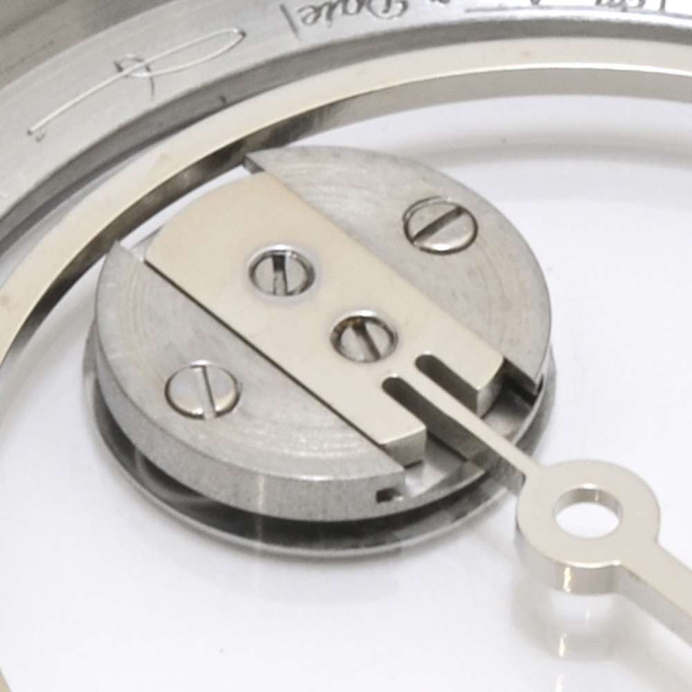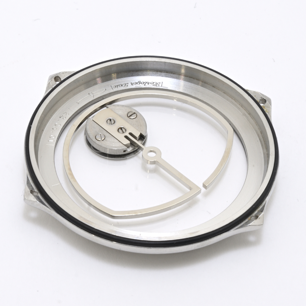 *裏スケのメモボックスです。独特の形状のゴング、そして裏面ガラスに取り付けられたボタン電池のようなパーツが印象的です。このボタン電池のようなパーツの内部は複雑な構造になっているような感じがするかもしれませんが、実際はネジで取り付けられているだけです。