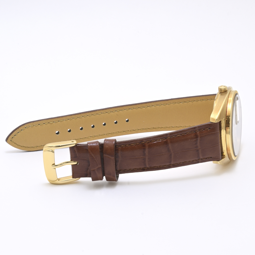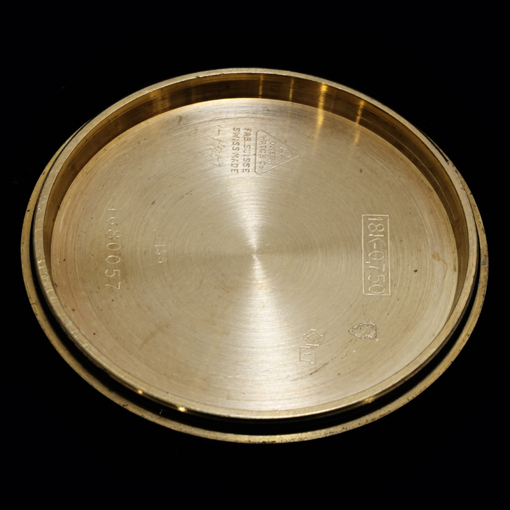 *革ベルトを外した本体の重さは56.3gです。実際の金の重さは30gくらいはあると思われますが、分解していないので何とも言えないところです。なお、当時のオメガは文字盤が18金製の場合がありますが、これは、文字盤を外して裏側を見てみないと分かりません。通常のシャンパン文字盤は真鍮に金メッキです。この個体の文字盤の材質は不明ですが、18金製も真鍮製も見た目は変わらないので、18金製の文字盤はコスパが悪いと言えるかもしれません。現在では超高級機も含めて18金製の文字盤はほとんどないと思います。ただ、バーインデックスが18金製というのは、特別珍しいものではありません。