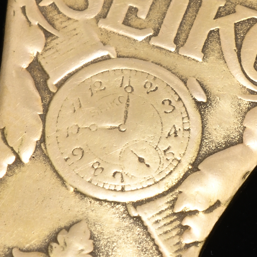 - おそらく1924~1928年頃 *国産初そしてセイコー初の腕時計は1913年(大正2年)「ローレル」ですが、「セイコー」ブランドの最初の時計は1924年(大正13年)です。このコジアケに描かれている腕時計の文字盤は「SEIKO」表記になっていますので1924年以降の製造ということは確実です。また「ーコイセ」のような右読みは1945年(昭和20年)の終戦を境に左読みに統一されていくので、1945年頃より古い製造ということも確実です。1938年(昭和13年)には日中戦争の影響で「金使用制限規則」が施行されていますので、これより古い年代の製造であることも確実です。また世界恐慌(1929年[昭和4年]〜)の影響で、日本は1930年から深刻な「昭和恐慌」に見舞われたとされていますが、和光の竣工が1932年(昭和7年)ですので、まだ最悪の状況ということではなかったのかもしれません。このコジアケの製造年代についてですが、なんとなく大正ロマンのような雰囲気が感じられる気がするので、1924年(大正13年)~1928年頃(昭和3年)に製造された可能性が高いように思われます。或いは和光竣工記念として製造された可能性があるかもしれないのでその場合は1924年(大正13年)~1932年(昭和7年)頃製造ということになるかもしれません。