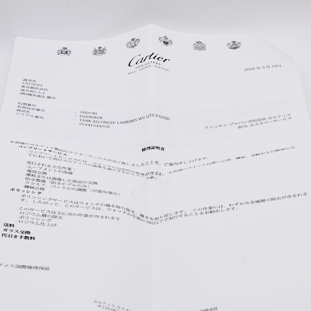 - *リシュモンジャパンにて磨きを含むコンプリートサービス済ですので、小キズも少なくきれいな状態です。コンプリートサービスの際、ガラスが交換されています。カルティエ修理明細の記述によれば、使い心地、機能、美観および精度の全てにおいて再びカルティエの基準を満たすものとなります。